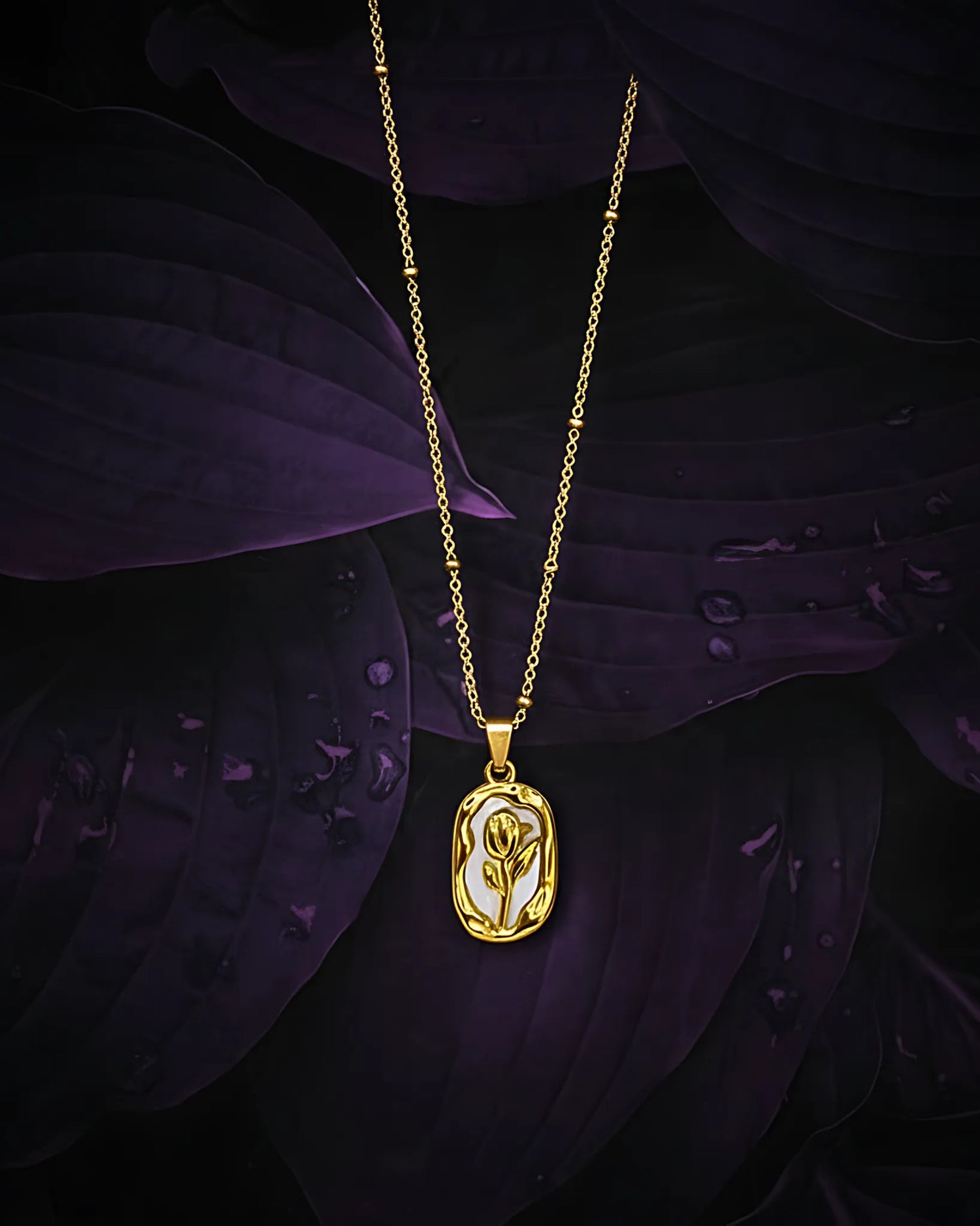 Graceful and poetic, this Anti-Tarnish Gold-Plated Rose Pendant captures the timeless beauty of a blooming rose, delicately encased in a flowing, handcrafted frame.